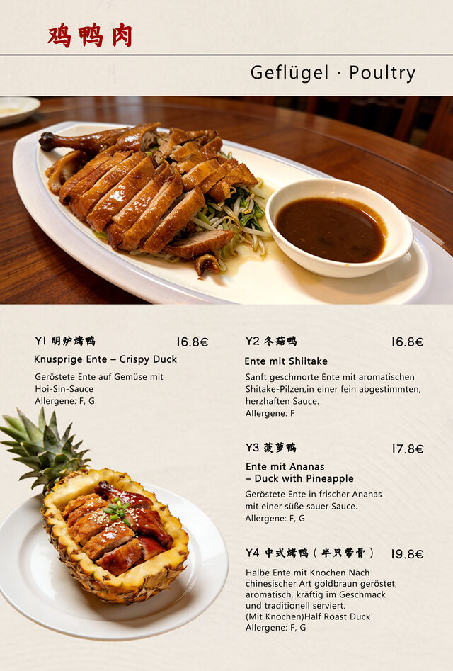 • Live-Tranchieren am Tisch: Wie in den besten Restaurants in China bieten wir Ihnen ein echtes Erlebnis-Dining. Unsere Köche tranchieren die Ente direkt vor Ihren Augen an Ihrem Tisch. So garantieren wir nicht nur absolute Frische, sondern auch ein visuelles Highlight für Ihren Besuch.