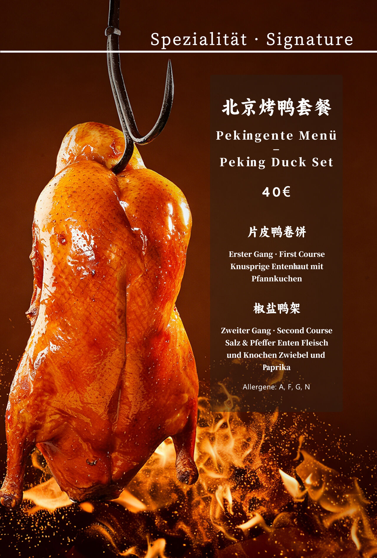 • Authentischer Genuss: Serviert mit hauchdünnen Pfannkuchen, frischen Frühlingszwiebeln, Gurkenstreifen und unserer hausgemachten, aromatischen Hoisin-Sauce.